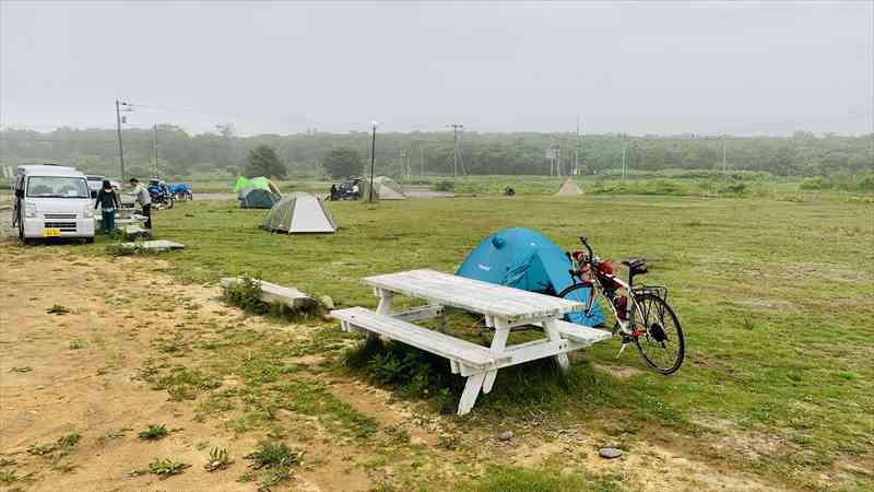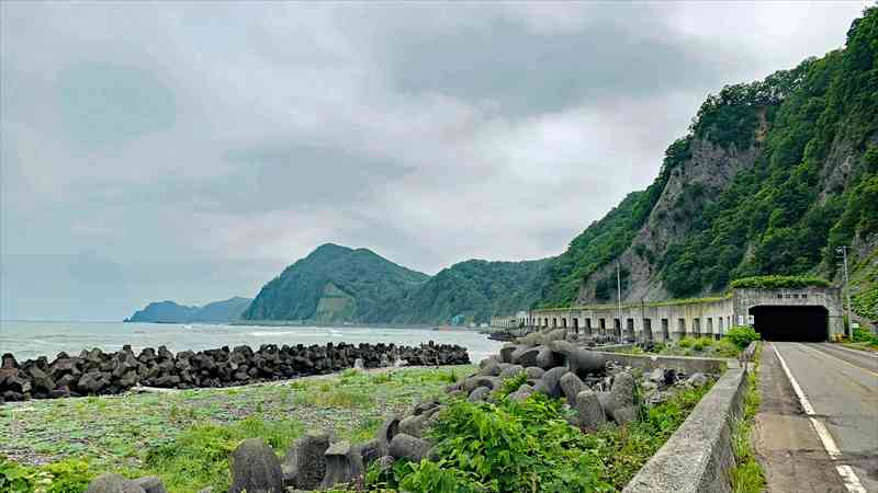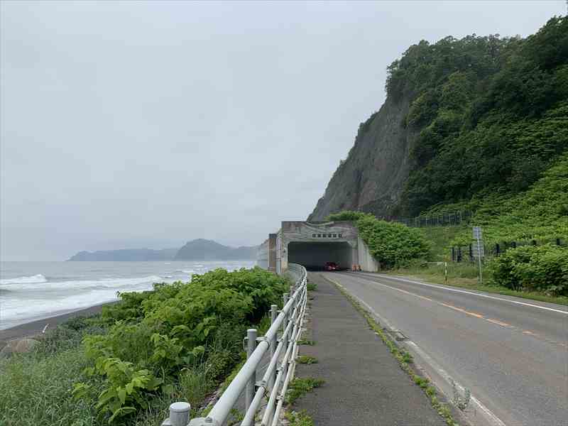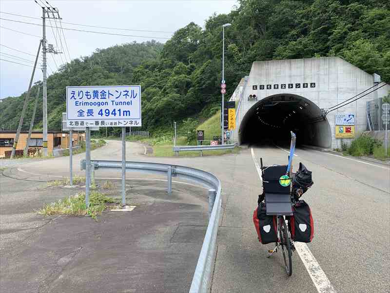 昨日の厚内駅から晩成温泉までと本日の広尾市街までのおおよそ80km弱は、お店どころか自販機すらなかった。 晩成温泉は8時からやっているので、朝風呂浴びることができる。広尾までは海は臨めないが、これまた北海道らしい道路を気落ちよく走ることができる。ただし、なにもない。本当になにもない。 広尾市街で昼食と夕食材料を調達したら、黄金道路でえりも町へ。断崖を切り開き、長い年月をかけて開通した国道336号線。黄金を敷き詰められるほど莫大な費用がかかったことから黄金道路と言われている。 その莫大な費用を象徴するかのように、道路トンネルとしては道内最長(全長4,941m)となる「えりも黄金トンネル」をはじめとした数々のトンネルがあり、まるで東京湾アクアラインを自転車で走っているような感覚だった。そして、トンネルの切れ目からは、断崖絶壁の海岸線の見事な景観を見ることができる。 | ||